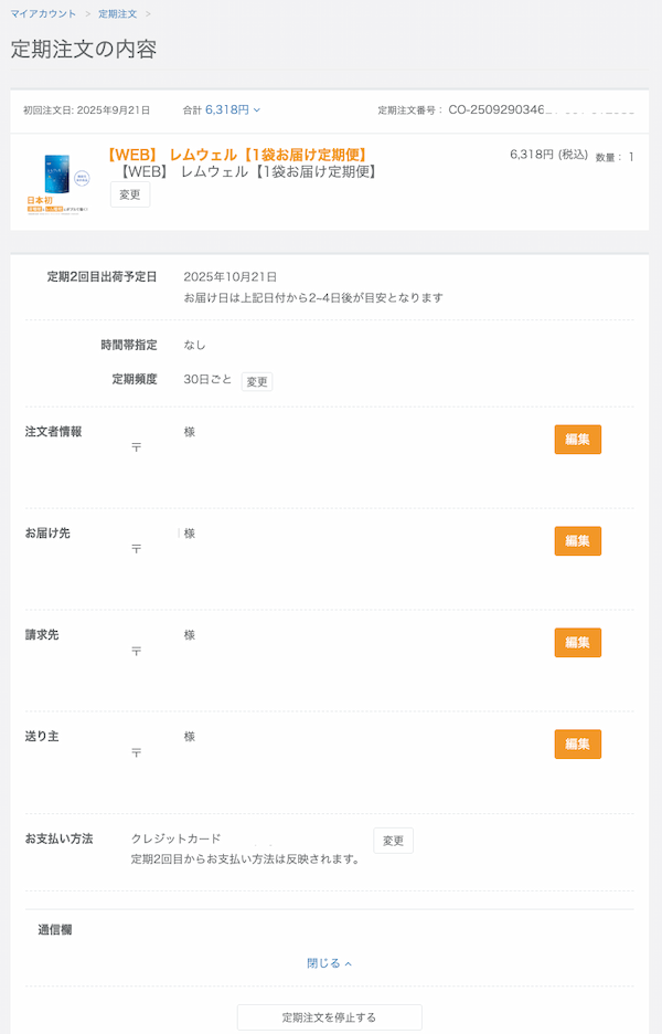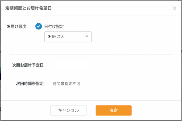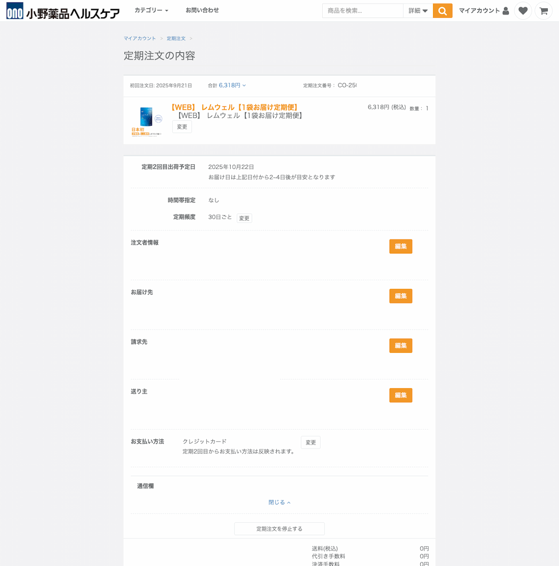 ご注文内容のキャンセル・変更は次回出荷予定日の2日前までにマイアカウントにてお手続きいただくか、「お客様相談室」までご連絡ください。