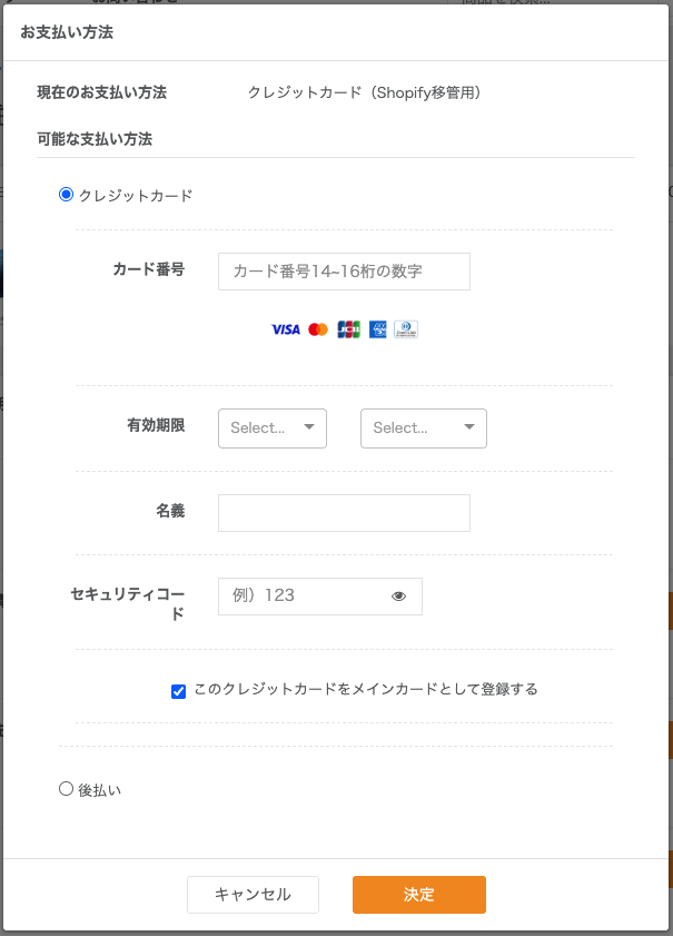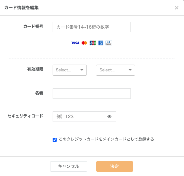 6.クレジットカード情報の入力画面が表示されますので入力し、「お支払い方法」の変更を完了してください。
