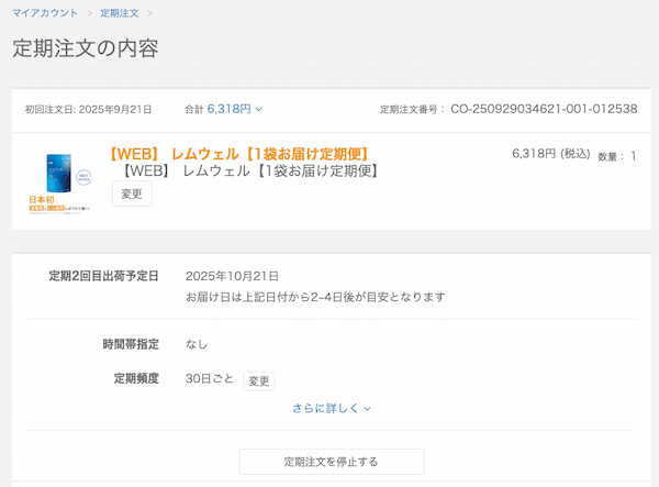 7.「定期注文の内容」画面で「さらに詳しく」をクリック。