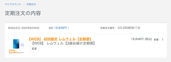3.「定期注文の内容」画面にて、商品名の下にある「変更」ボタンをクリック