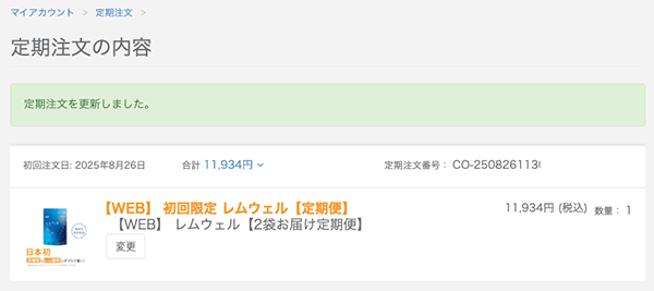 5.「定期注文の内容」画面にて「定期注文を更新しました。」と表示されると、変更完了です。